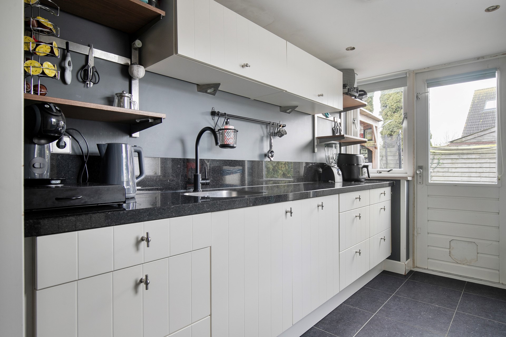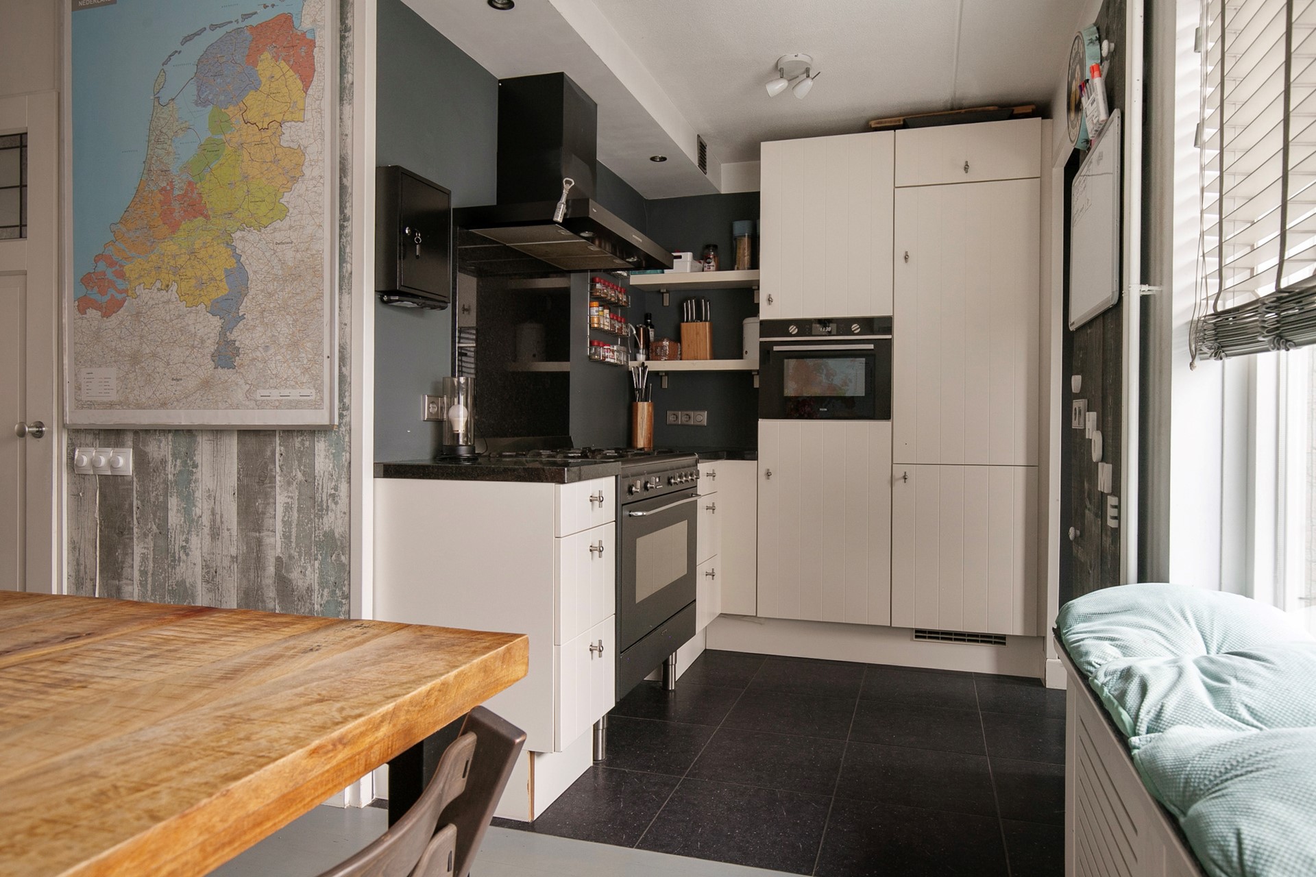 De halfopen keuken aan de achterzijde is doorgetrokken in de aanbouw/bijkeuken en vormt daarmee een ruime en functionele werk- en leefruimte. In verband met de volledige gasloosheid van de woning zal het gasfornuis verwijderd, waardoor de keuken is voorbereid op elektrisch koken en aansluit bij hedendaagse eisen op het gebied van duurzaamheid en wooncomfort.