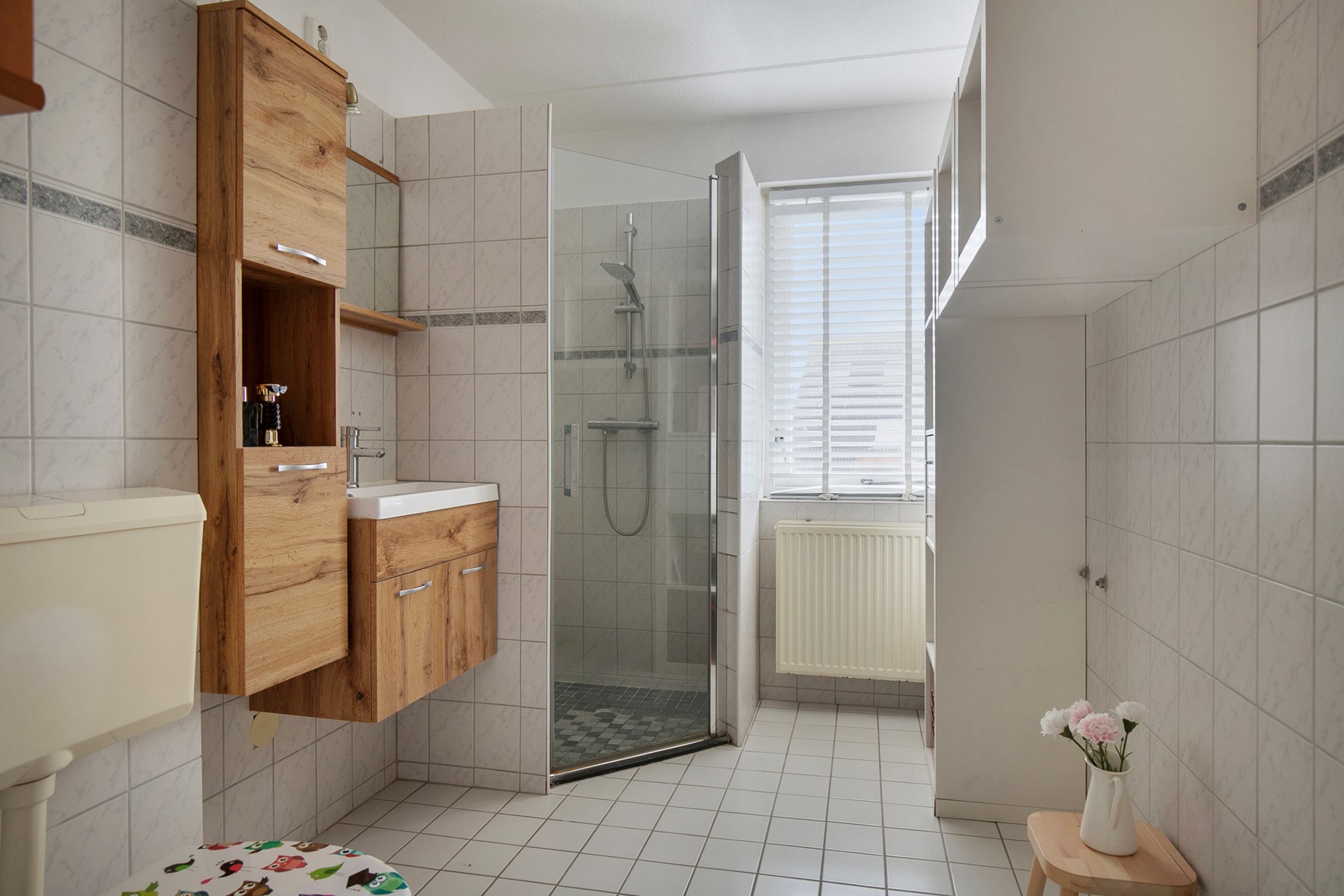De eerste verdieping telt drie ruime slaapkamers met rolluiken, waaronder een master bedroom met inbouwkast en airco. De badkamer is compleet ingericht met douchecabine, wastafelmeubel en toilet.