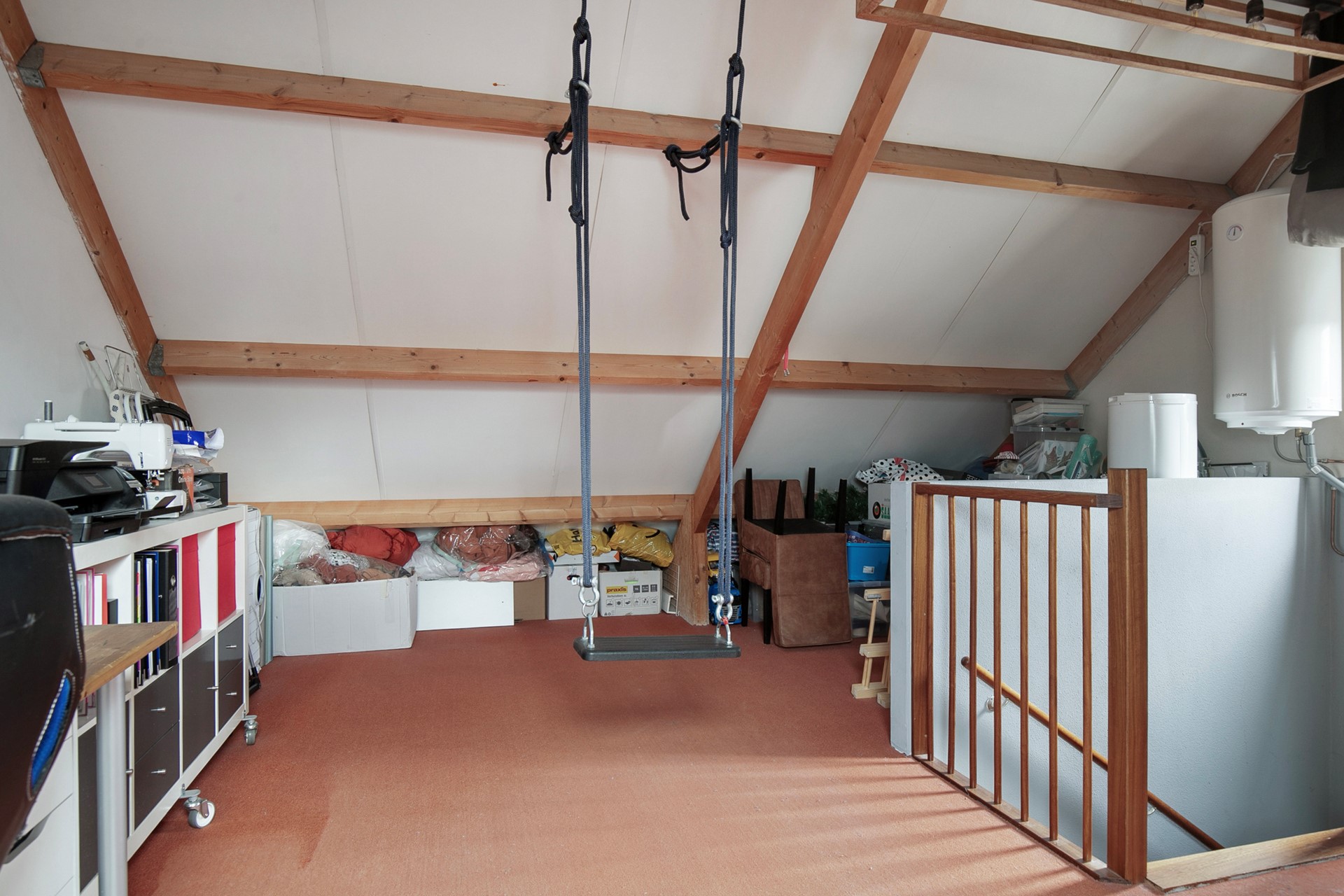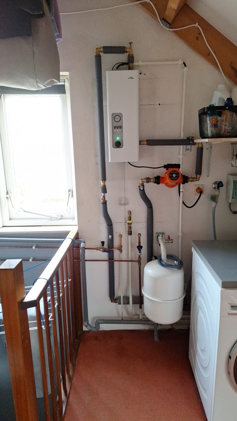 De tweede verdieping is bereikbaar via een vaste trap en beschikt over een raam in de zijgevel. Deze ruimte is flexibel naar eigen inzicht in te delen en herbergt de elektrische boiler, de elektrische c.v.-ketel, wasmachineaansluiting, omvormer van de zonnepanelen en mechanische ventilatie.
