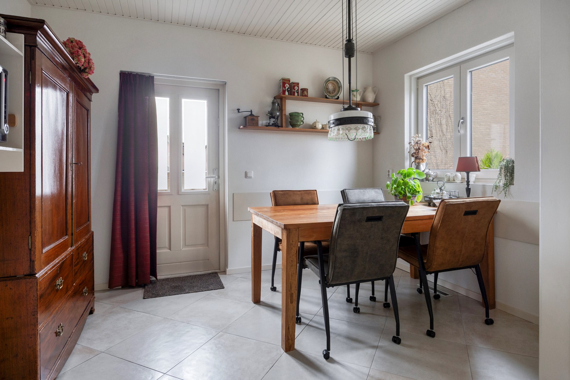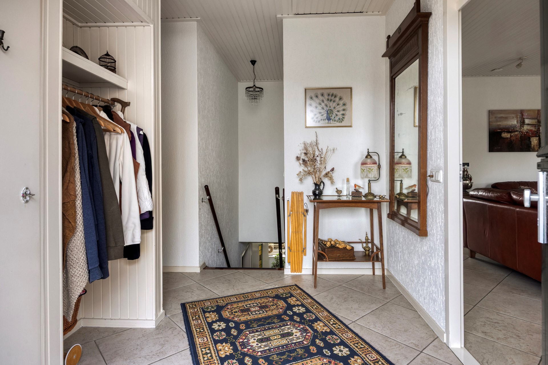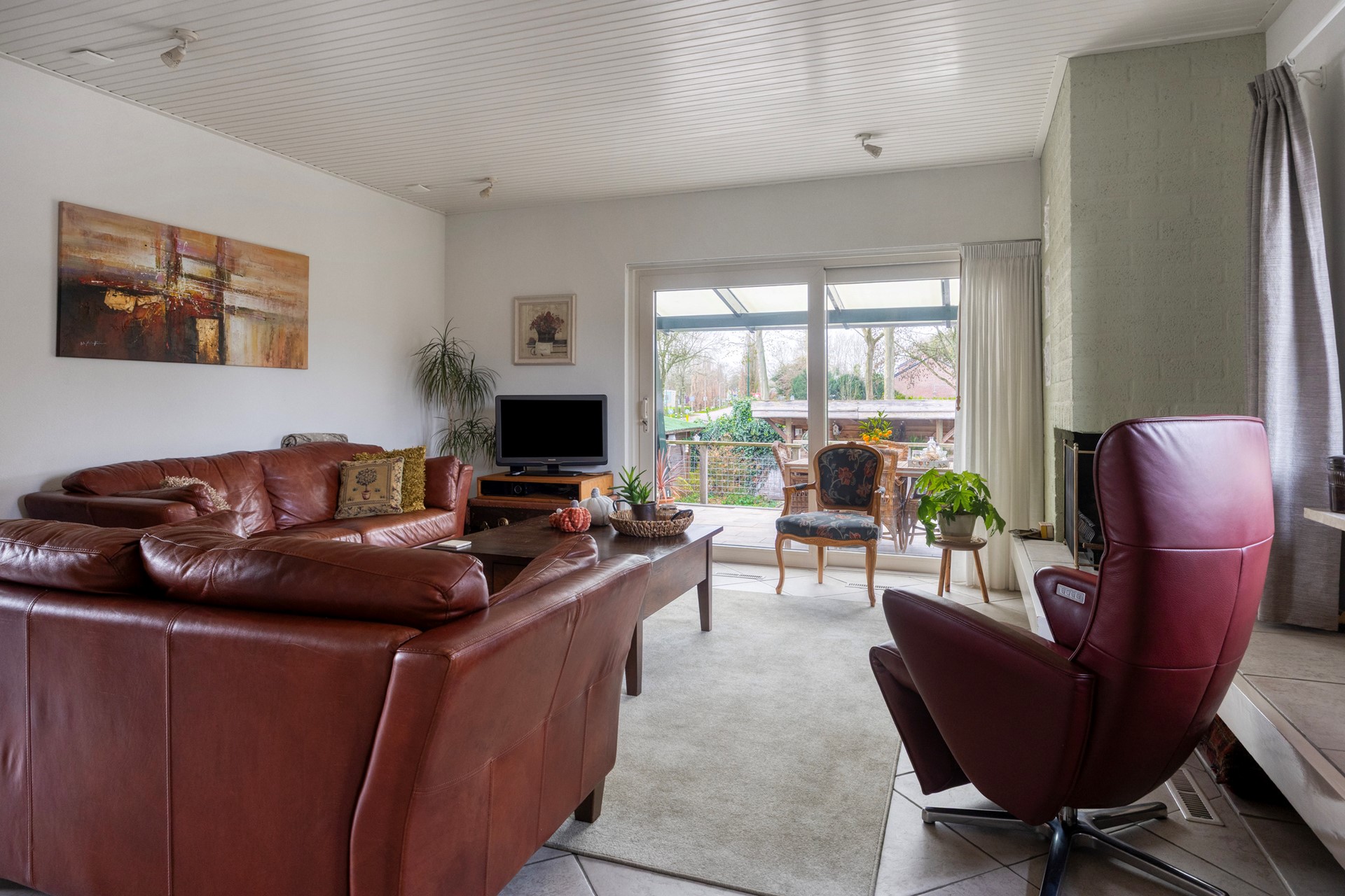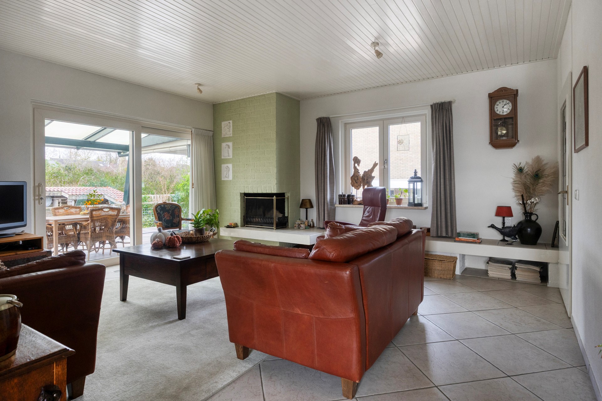 Aan de voorzijde bereikt men de woning via een karakteristieke, hooggelegen trap die direct toegang geeft tot de entree. Binnenkomst vindt plaats in een ruime hal, van waaruit de leefvertrekken zich op een logische wijze ontvouwen. De woonkamer is licht, royaal en voorzien van een sfeervolle open haard; een aangename ruimte voor zowel ontspannen als representatief wonen. Vanuit de woonkamer is er directe verbinding met het verhoogde terras aan de linker zijde, dat een fraai uitzicht biedt over de tuin en gedurende veel momenten van de dag een zonnige plek vormt.