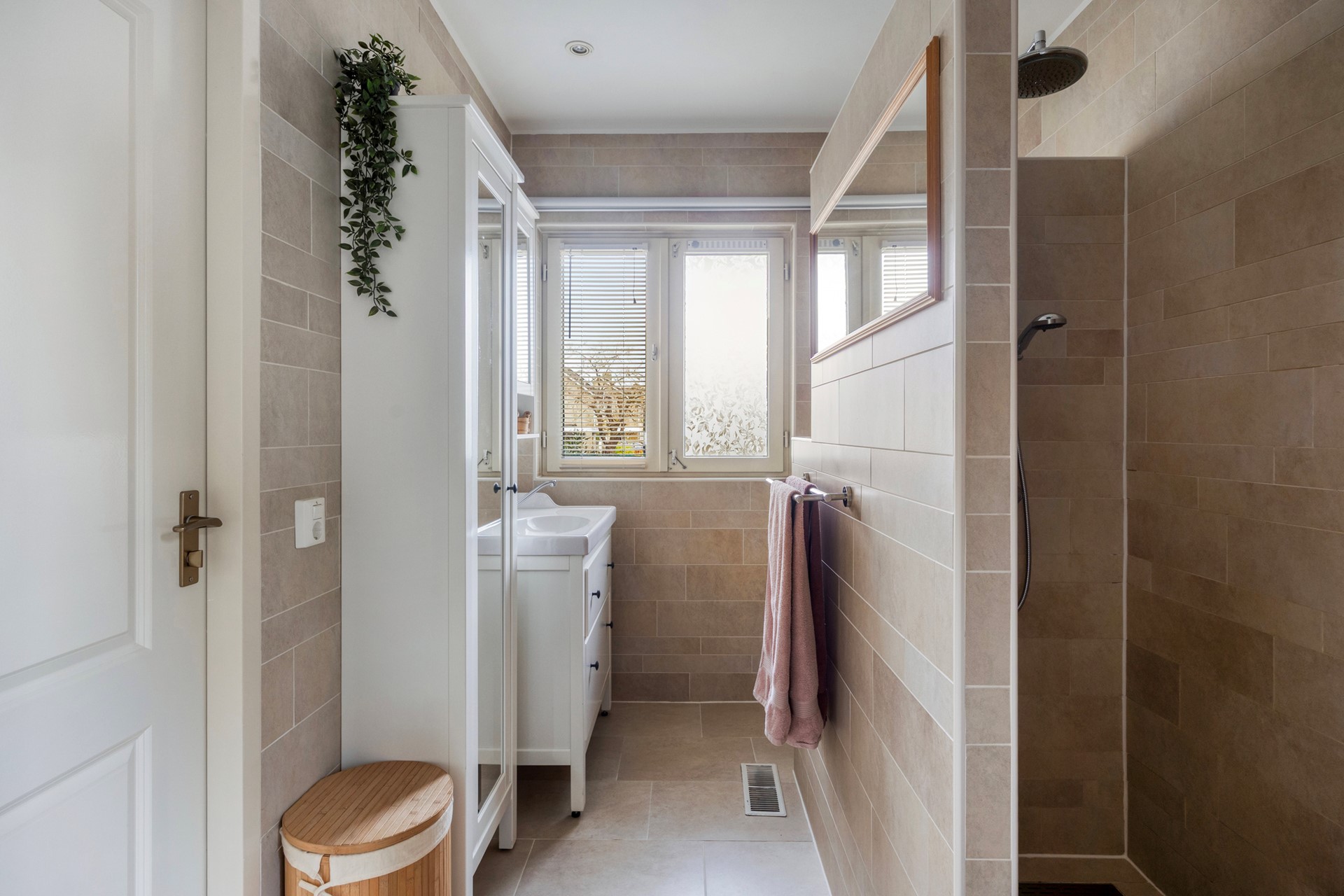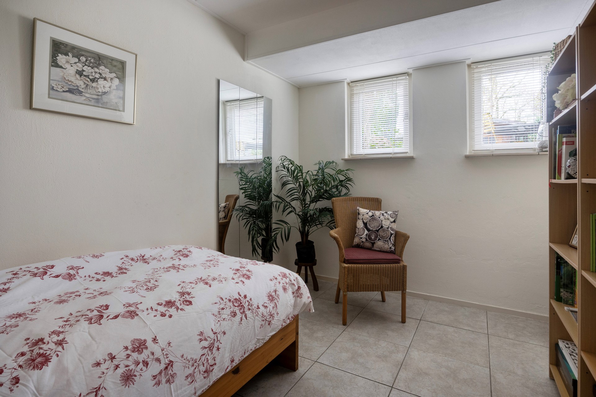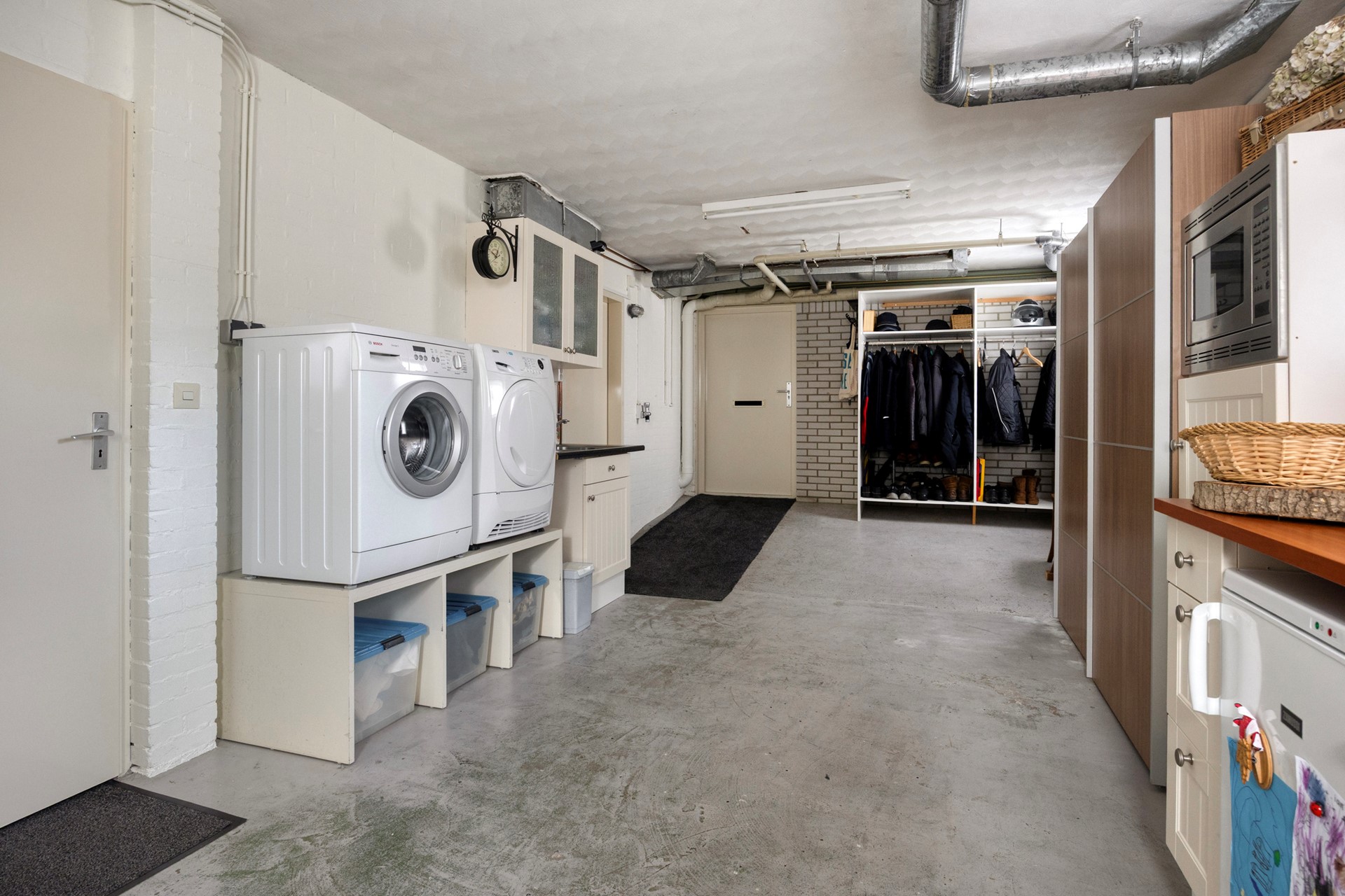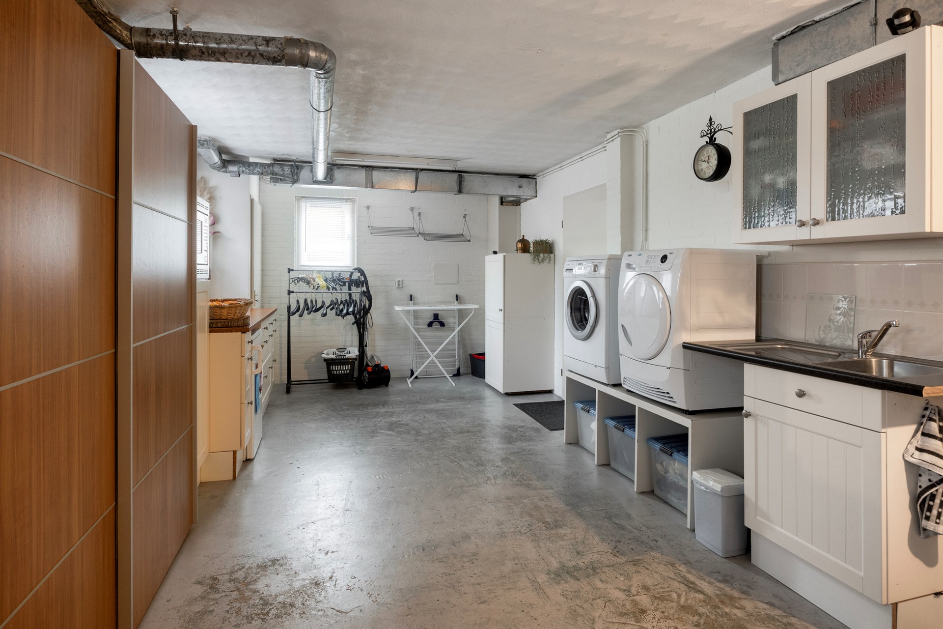 Vanuit de hal met toilet leidt een trap naar het souterrain. Dit lager gelegen woondeel herbergt twee slaapkamers, waarvan één is uitgerust met een ruime inloopkast. Daarnaast bevindt zich hier een tweede badkamer met douche en wastafel. De naastgelegen bijkeuken beschikt over een wasmachineaansluiting, meterkast en een keukenblok met spoelbak (met wateraansluiting). Verder biedt dit niveau een kantoorruimte, ideaal voor thuiswerken, en een technische ruimte met de Remeha cv-ketel (2024) en de heteluchtverwarming. Een waterput zorgt ervoor dat het water van de badkamer, keuken en wasmachine – vanwege de lagere ligging – gecontroleerd wordt opgepompt naar het riool.