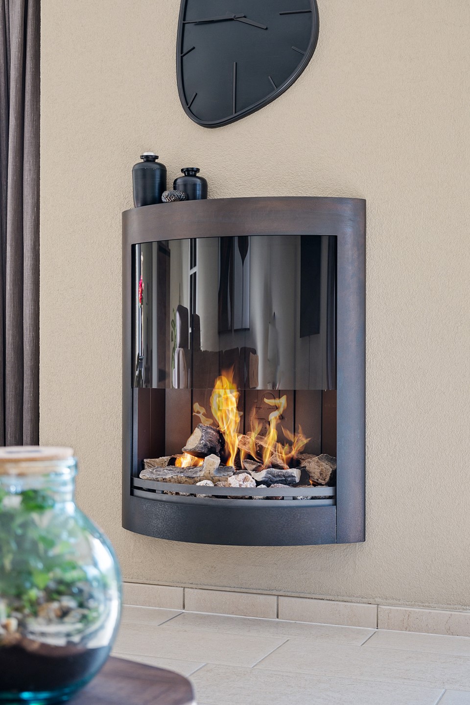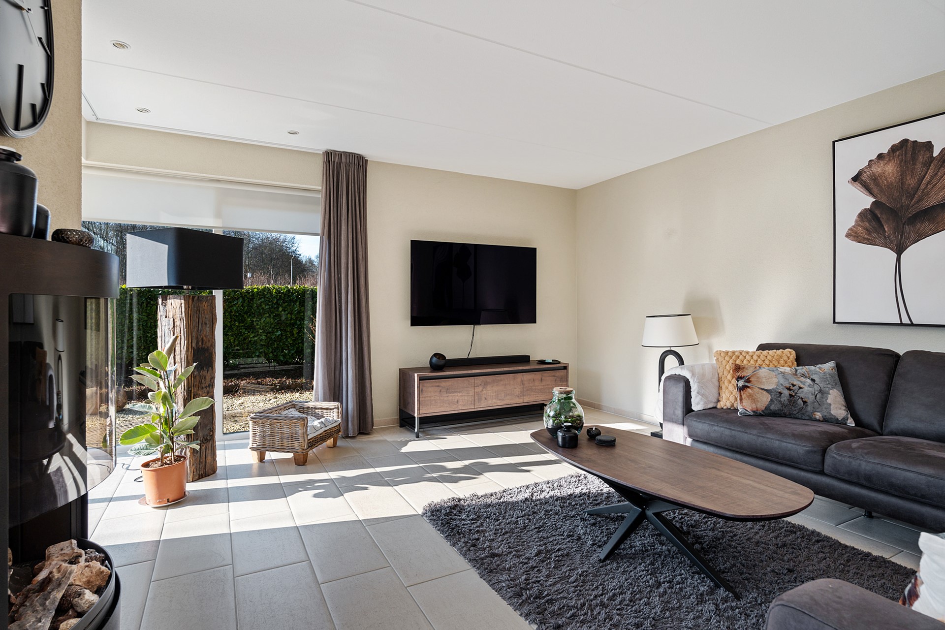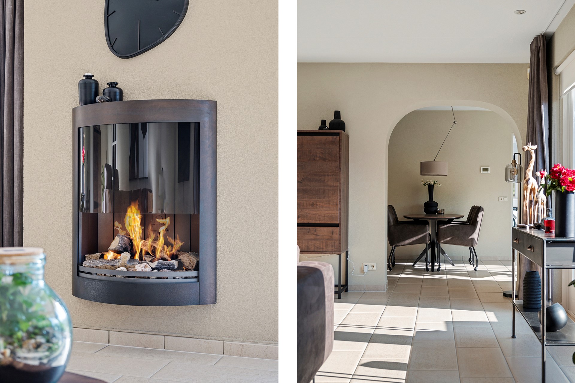 • Woonkamer met gashaard en schuifpui naar het terras.